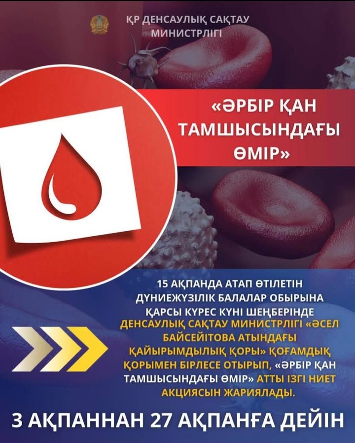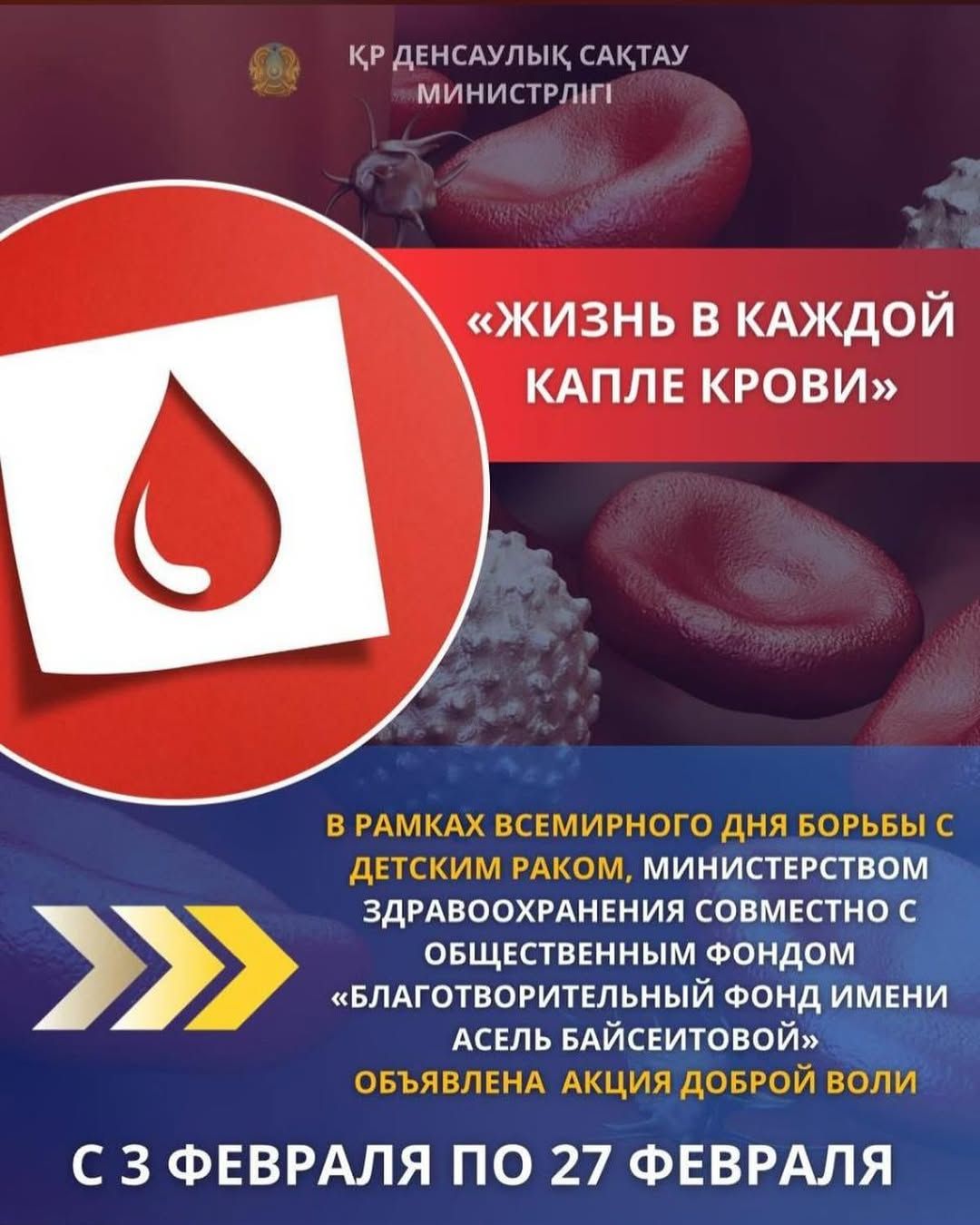 МИНЗДРАВ: В КАЗАХСТАНЕ СТАРТОВАЛА АКЦИЯ «ЖИЗНЬ В КАЖДОЙ КАПЛЕ КРОВИ»