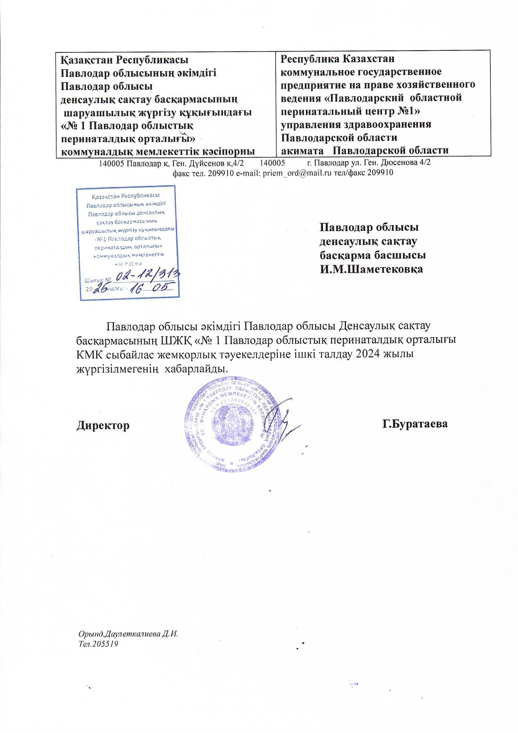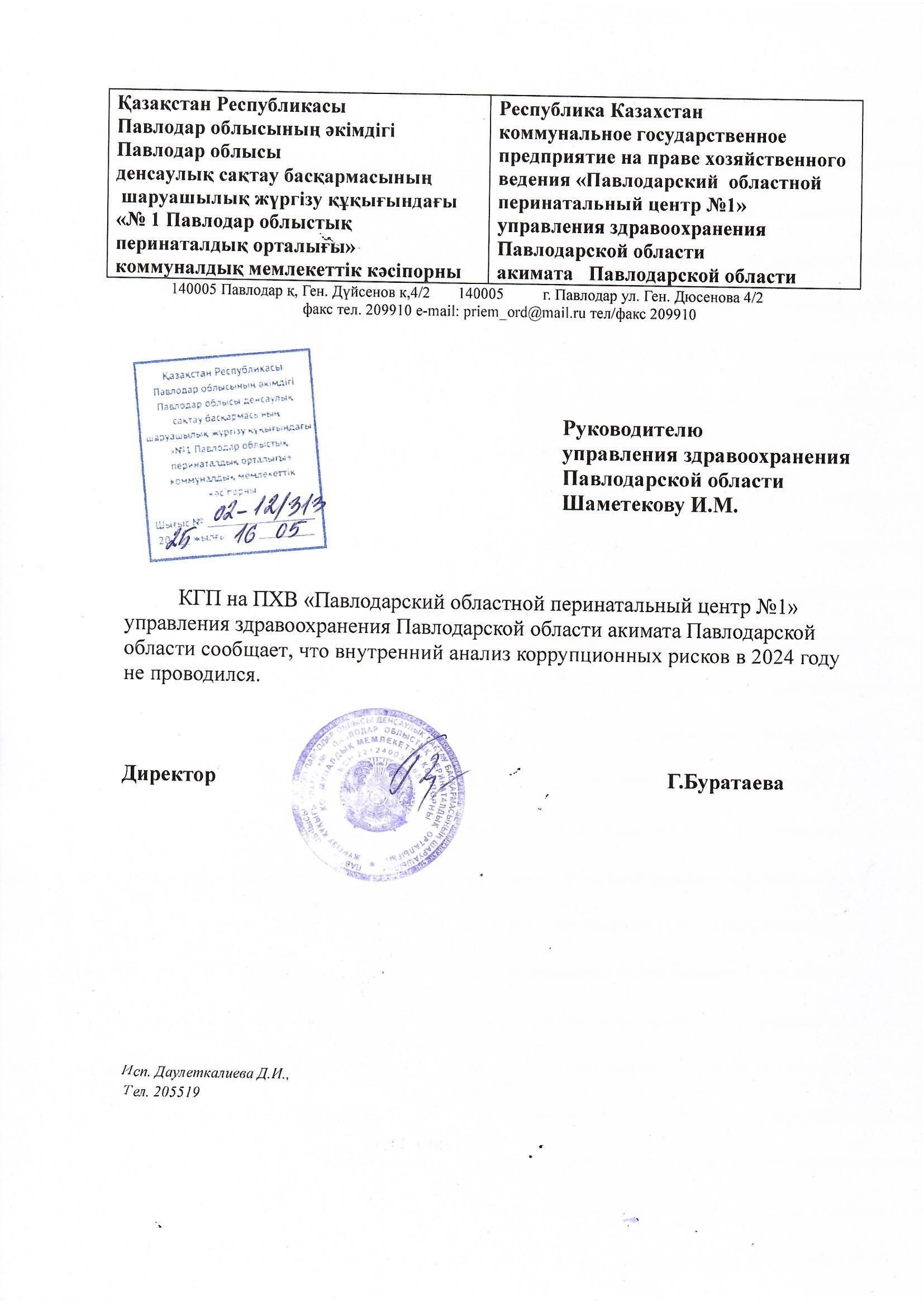 Павлодар облысы әкімдігі Павлодар облысы Денсаулық сақтау басқармасының ШЖҚ «№ 1 Павлодар облыстық перинаталдық орталығы КМК сыбайлас жемқорлық тәуекелдеріне ішкі талдау 2024 жылы