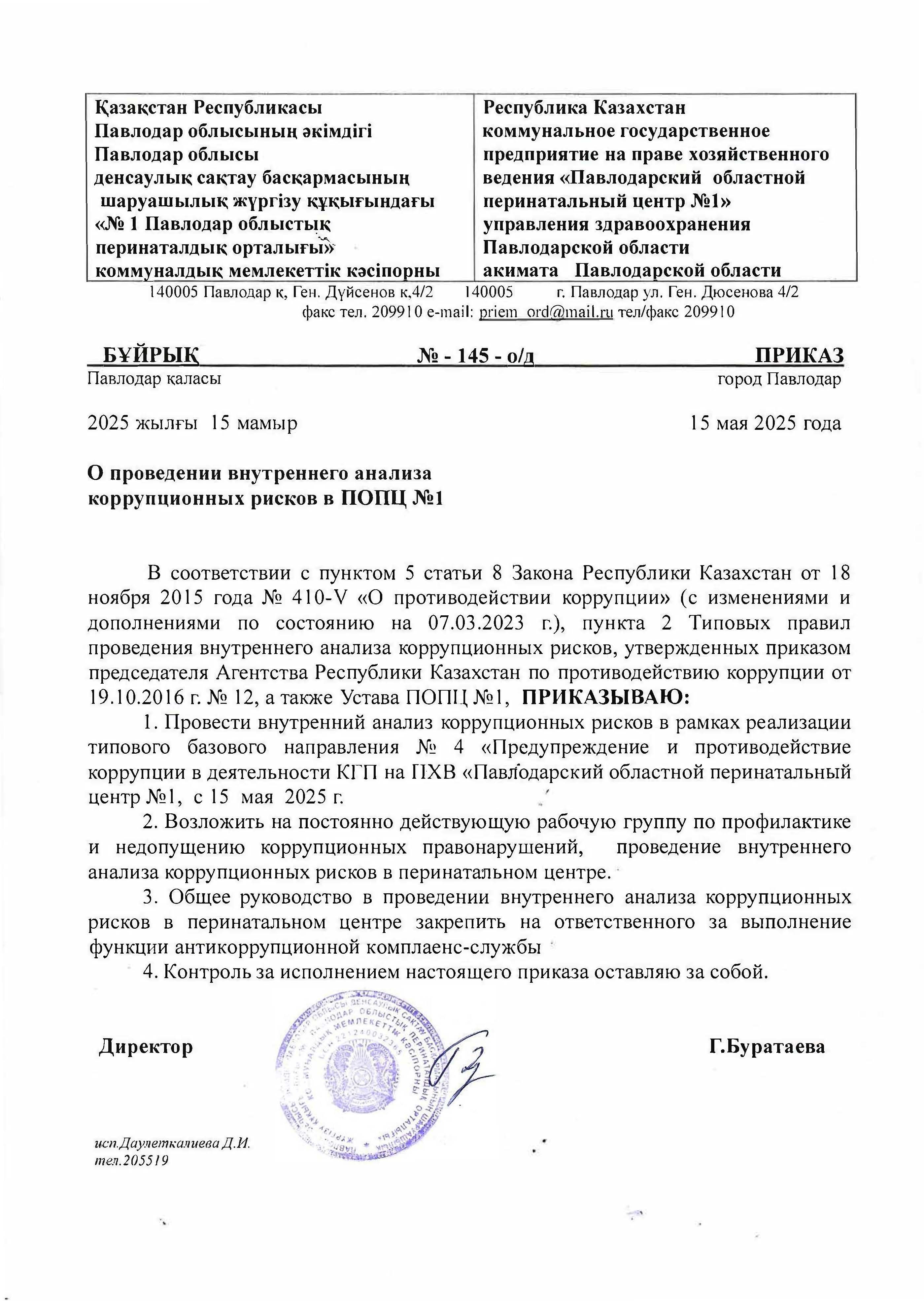 2025 жылғы 15 мамырдағы № - 145 - о/д Бұйрығы: "№ 1 ПОПЦ- даFы сыбайлас жемкорлык '-- iшкi талдау жургiзу туралы"