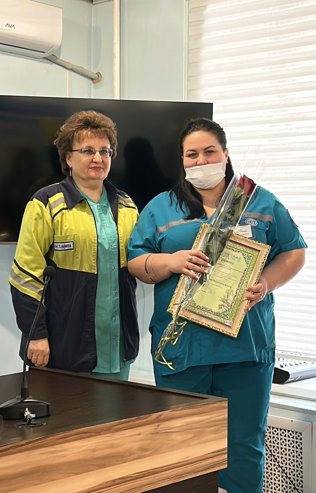 А также, от руководителя СМП за подписью Ахметжанова К.К.были награждены грамотами сотрудники СМП: Кусайнов Сырым Сергазыұлы - врач централной станции СМП, Жумалинов Асет Айдарович - фельдшер ПШБ Штат спец. бригады УЗО, Капуза Эльвира Витальевна - машинист по стирке белья.