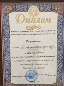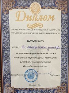 01.10.16г. команда КГП на ПХВ «ПООД» приняла участие в областном туристическом слете среди работников здравоохранения и заняла 1 место в оформлении туристической палатки и второе общекомандное место из 25 команд. По итогам слета команде ПООД были вручены кубок и две почетные грамоты.